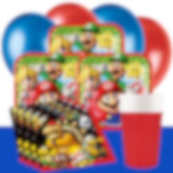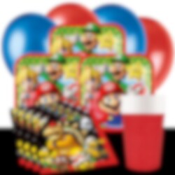 Komplett festpakke, fyldt med Super Mario-tilbehør. Skab en uforglemmelig fødselsdagsfest med festartikler prydet med de elskede karakterer fra Super Mario-universet. Pakken indeholder Super Mario-tallerkener (18 cm), røde papkrus (266 ml) og Super Mario-servietter (33 x 33 cm) til 8, 16 eller 24 personer.