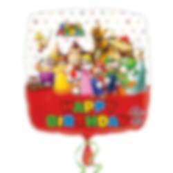 Dekorativ folieballong med texten "Happy Birthday" och med motiv av Mario och gänget från den klassiska spelserien Super Mario Bros. Dekorera kalasrummet med denna för att skapa en kul stämning. Ballongen blir ca 43 cm i diameter uppblåst. Kan blåsas upp med vanlig luft eller helium.