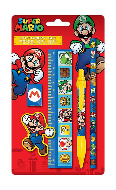 Sjovt skolesæt med Super Mario-motiver. Perfekt at give til dem der elsker Mario. Pakken indeholder en blyant, en kuglepen, en lineal, en blyantspidser og et viskelæder.
