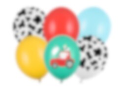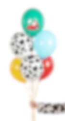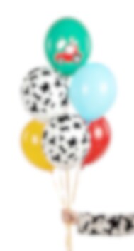 Pakken indeholder 2 hvide balloner med sorte ko-pletter, 1 gul ballon, 1 rød ballon, 1 rød ballon, 1 rød ballon, 1 hvid ballon med sorte ko-pletter. 1 lyseblå ballon og 1 turkis ballon med et rødt traktormotiv.