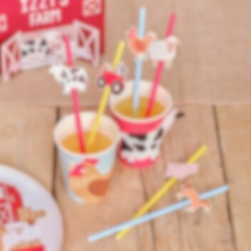 16 stk. papsugerør i flotte farver og med motiver af søde små bondegårdsdyr og en traktor ovenpå. Sugerørene er 19 cm lange.