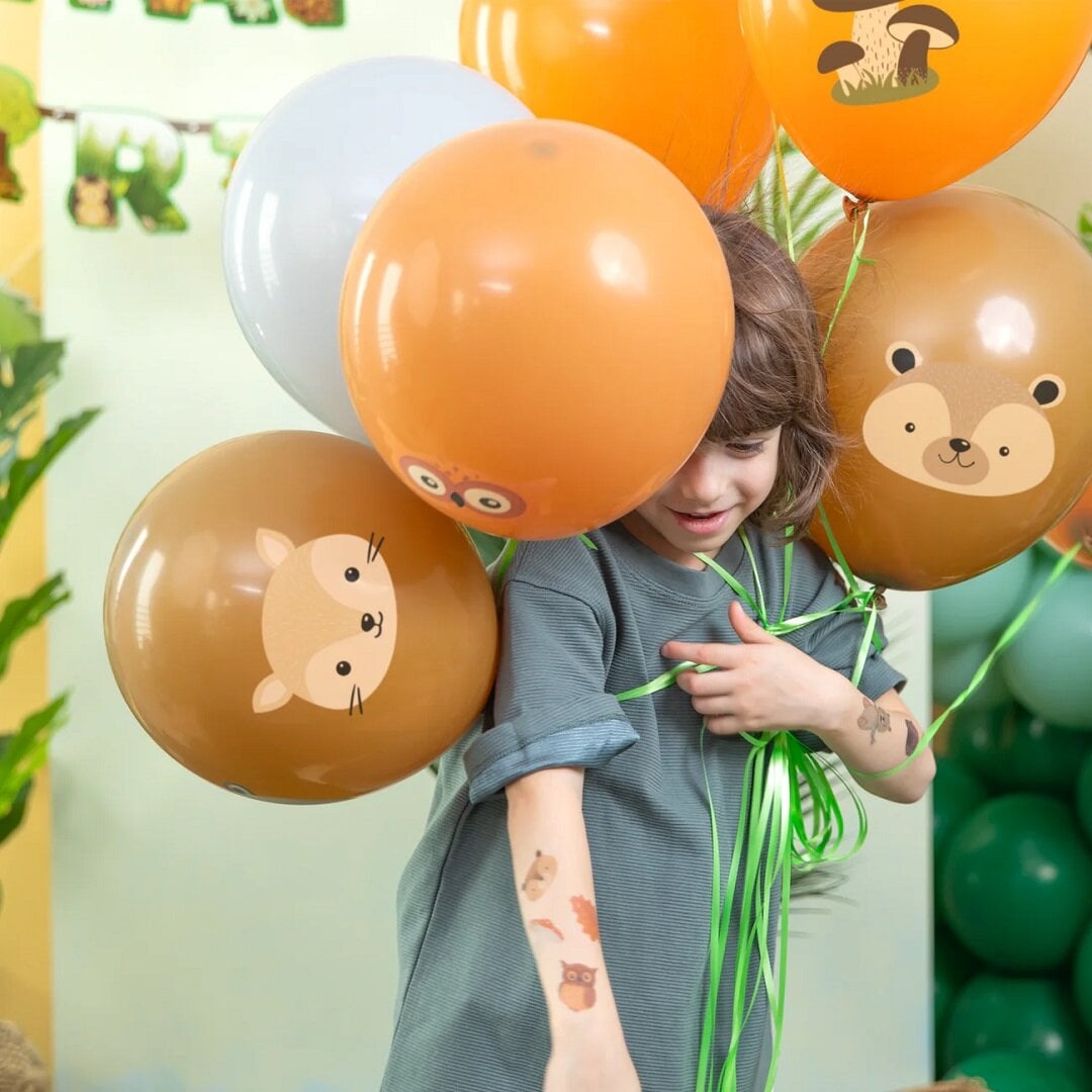 8 stk. latexballoner i en smuk farvekombination med søde motiver af forskellige skovdyr.
