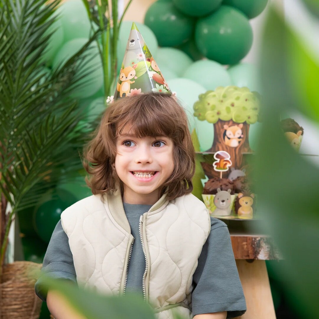 6 stk. festhatte i smukke farver med søde motiver af skovdyr, perfekte til en fødselsdag med skovtema.