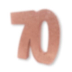 Meget smuk og imponerende borddekoration, der glitrer i rosaguld. Dekorationen er formet som tallet 70 og bliver et centerpiece på dit dækkede bord til 70-årsdagen. Dekorationen er 19,5 x 20 cm stor.