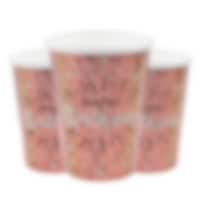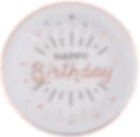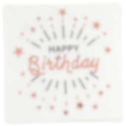 10 hvide servietter med et utroligt flot motiv med teksten "Happy Birthday" omgivet af stjerner i rosaguld. Servietterne er 2-lagede og måler ca. 33 x 33 cm udfoldet.