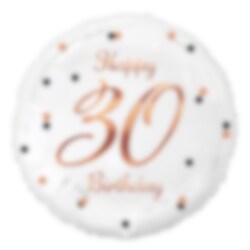 Attraktiv hvid folieballon med trykte motiver i sort og rosa guld med tallene 30 i midten. Ballonen vil være en smuk dekoration til 30-års fødselsdagsfesten. Tilføj andre balloner for at lave en smuk buket. Folieballonen har en selvforseglende ventil og kan nemt fyldes med en ballonpumpe. Hvis du ønsker det, kan du bruge helium til at få ballonen til at flyde. Du kan også købe en ballonvægt og en ballonsnor.