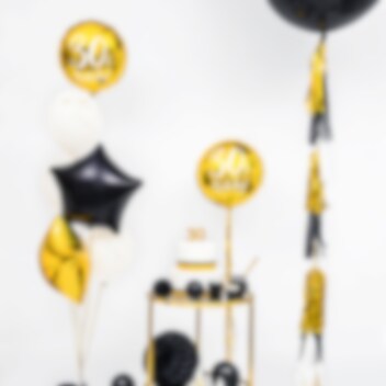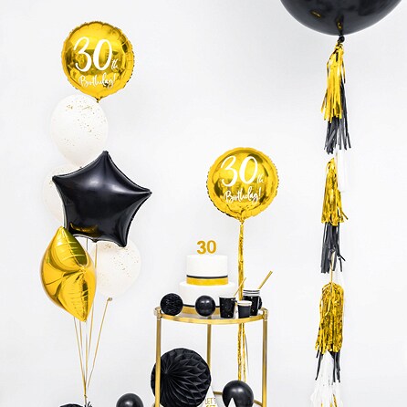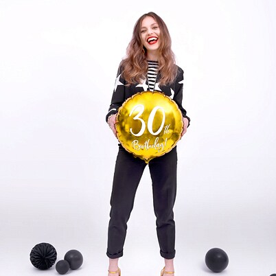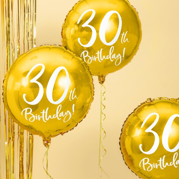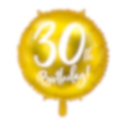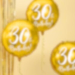 Elegant folieballon i guldmetal med hvidt tryk hvor der står "30th Birthday!". Ser flot ud når den er fyldt med luft eller helium, og til at dekorere med til 30-års fødselsdagsfesten. Ballonen bliver ca. 45 cm stor.
