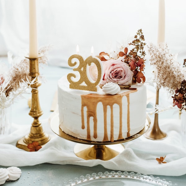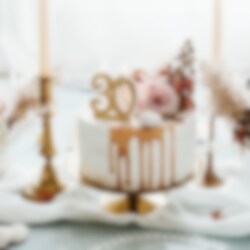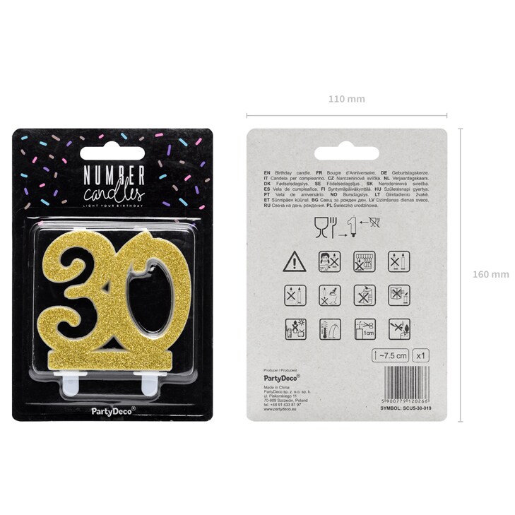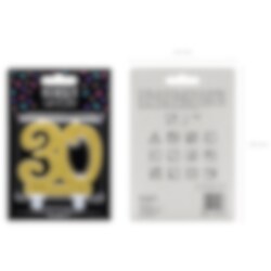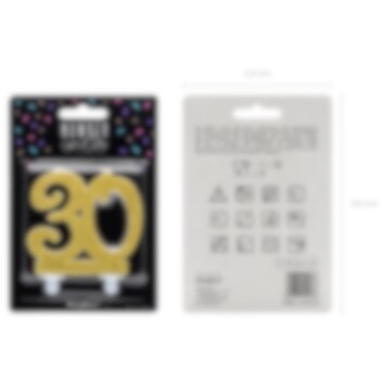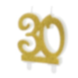 Fint kagelys i glitrende guld at sætte i kagen, når det er tid til at fejre en fødselsdag. Kagelyset består af nummeret 30 og er perfekt til 30-års fødselsdagen. Kagelyset er 7,5 cm stort.