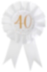 Smuk roset i hvidt og guld med tallet 40 på. Rosetten kan bruges både som et dekorativt tilbehør i eksempelvis blomsterarrangementer eller bæres af dig på din 40-års fødselsdag. Rosetten er 8 cm i diameter og 15 cm høj.