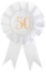 Smuk roset i hvidt og guld med tallet 50 på. Rosetten kan bruges både som et dekorativt tilbehør i eksempelvis blomsterarrangementer eller bæres af dig på din 50-års fødselsdag. Rosetten er 8 cm i diameter og 15 cm høj.