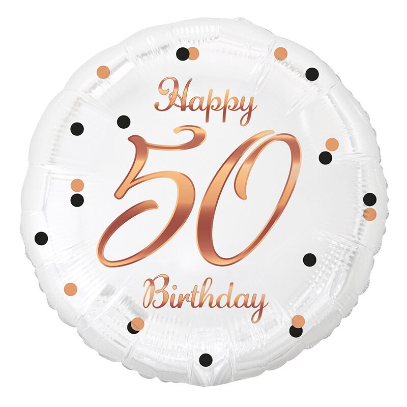 Fantastisk hvid ballon med trykte motiver i sort og rosa guld med tallene 50 i midten. Ballonen vil være en smuk dekoration til din 50-års fødselsdag. Tilføj andre balloner for at lave en smuk buket. Folieballonen har en selvforseglende ventil og kan nemt fyldes med en ballonpumpe. Hvis du ønsker det, kan du bruge helium til at få ballonen til at flyde. Du kan også købe en ballonvægt og en ballonsnor.