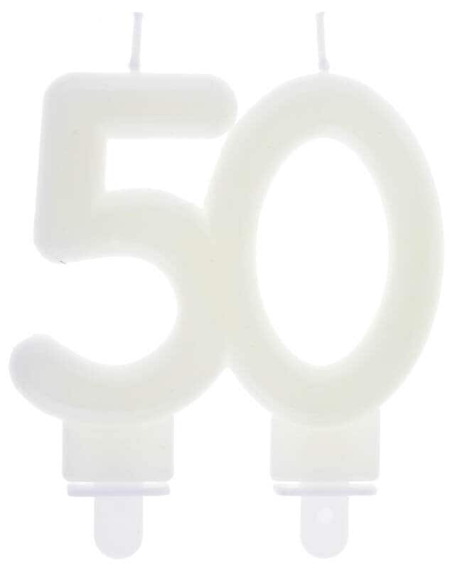 Kagelys, der lyser i mørket, elegant formet som tallet 50. Kagelyset har en størrelse på 7,5 x 9 cm.