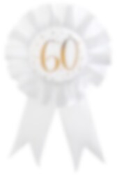 Smuk roset i hvidt og guld med tallet 60 på. Rosetten kan bruges både som et dekorativt tilbehør i eksempelvis blomsterarrangementer eller bæres af dig på din 60-års fødselsdag. Rosetten er 8 cm i diameter og 15 cm høj.