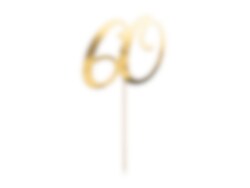 Smuk kagedekoration med motiv nummer 60 i guldfolie. Perfekt at dekorere kagen med til 60-års fødselsdagen. Kagedekorationen er ca. 19 cm stor.