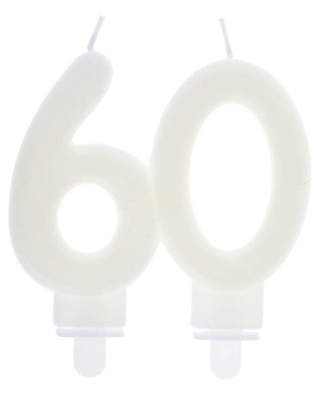 Kagelys, der lyser i mørket, elegant formet som tallet 60. Kagelyset har en størrelse på 7,5 x 9 cm.