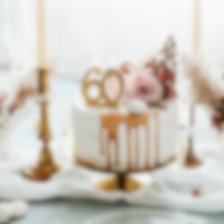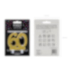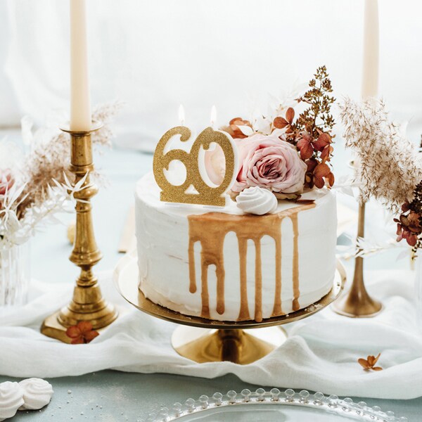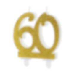 Flot kagelys i glitrende guld at sætte i kagen, når det er tid til at fejre fødselsdag. Kagelyset består af nummeret 60 og er perfekt til 60-års fødselsdagsfesten. Kagelyset er 7,5 cm stort.