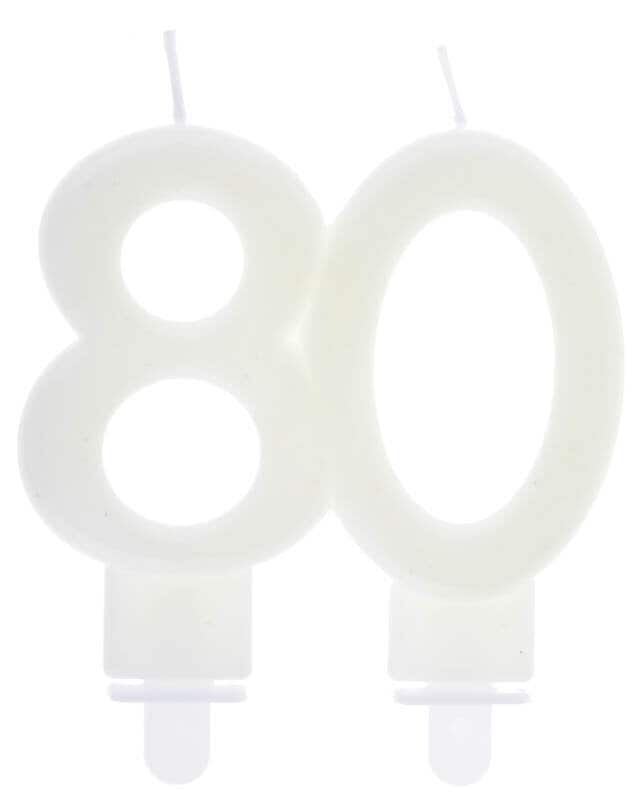 Kagelys, der lyser i mørket, elegant formet som tallet 80. Kagelyset har en størrelse på 7,5 x 9 cm.