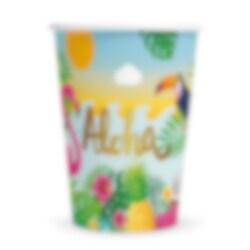 Server kolde drikke i disse farverige papkrus med Aloha-motiv. Det sommerlige design med flamingo, tukan, ananas, vandmelon, blomster og palmer skaber en dejlig feriestemning og passer perfekt til sommerfest, Hawaii-fødselsdag, poolparty eller tropisk tema.