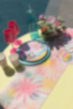 Pastelfarvet og smuk bordløber, der med sit design bringer tankerne til et varmere sted med lækre palmer. Bordløberen er perfekt, hvis du vil arrangere en hyggelig sommerfest.