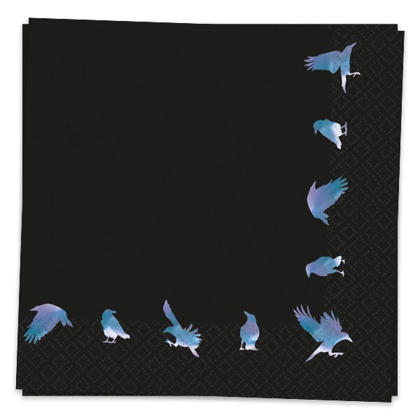 16 stk. sorte servietter med motiver på begge sider af ravne i lilla nuancer. Et fint supplement til borddækningen til festen med Halloweentema. Servietterne er 2-lags og er ca. 33 x 33 cm store.