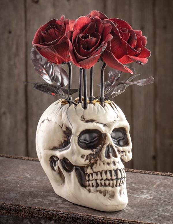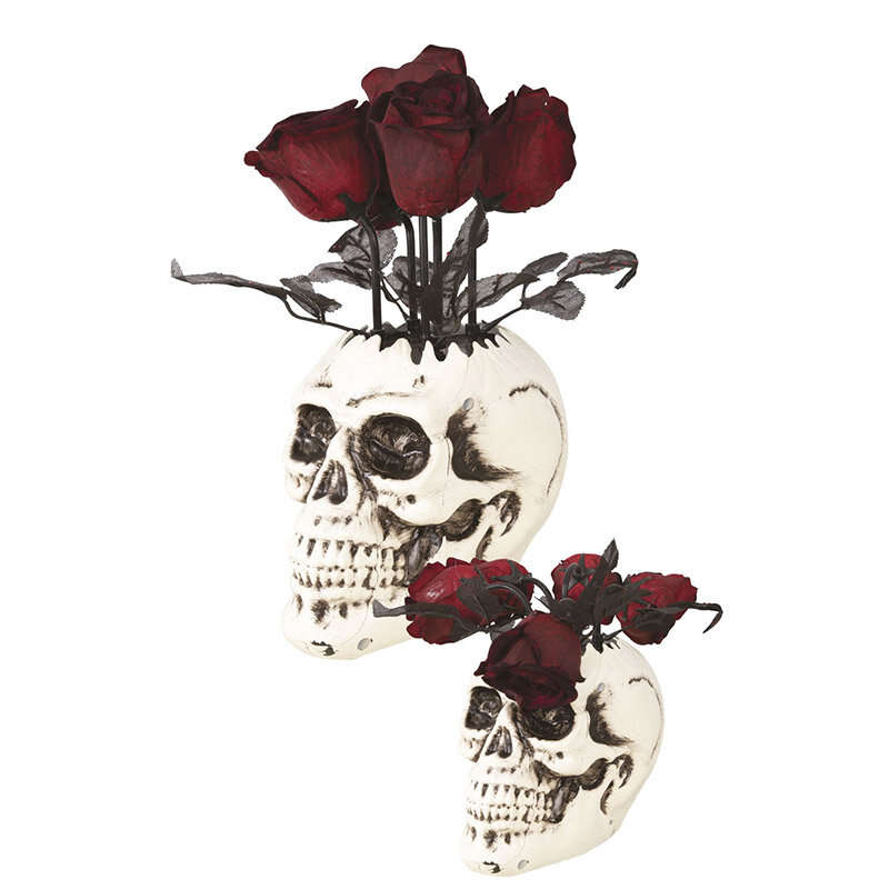 En spektakulær Halloween-dekoration, der helt sikkert vil tiltrække opmærksomhed. Denne vase i form af et dødningehoved er pyntet med fem røde roser, der bevæger sig og visner, når vasen er tændt, en uhyggelig effekt, der skaber den rette stemning til festen. Vasen er ca. 30 cm høj og drives af indbyggede batterier.