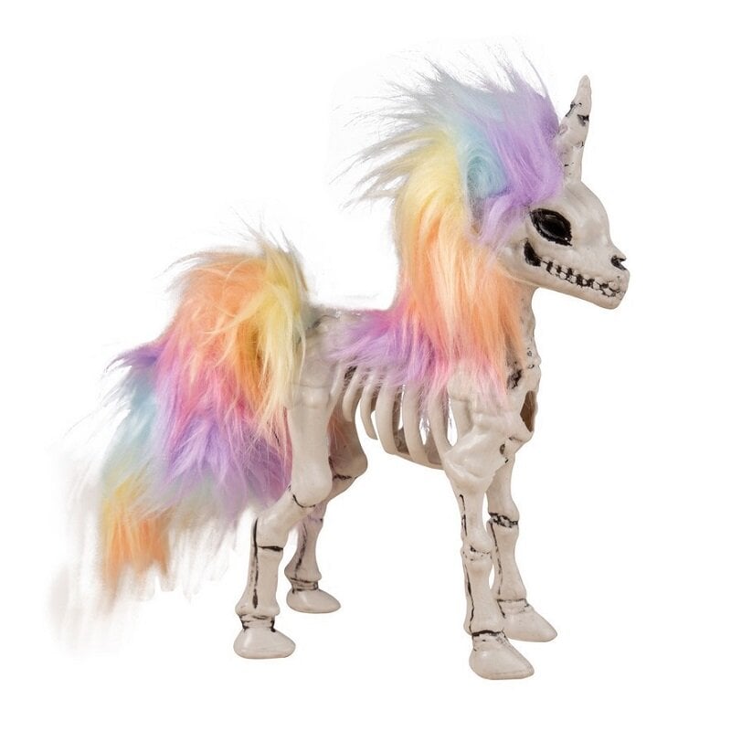 Sej Halloweendekoration i form af et enhjørningsskelet med pastelfarvet man og hale. En unik og iøjnefaldende dekoration, der giver en både skræmmende og magisk touch, når Halloween nærmer sig.