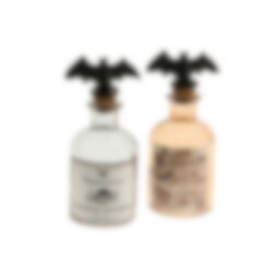 Flot glasflaske med en flagermus på korken, perfekt som en sej dekoration til Halloween. Fyld den med en uhyggelig drik og stil den frem for at forstærke den uhyggelige stemning.