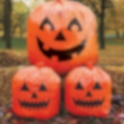 3 stk. havedekorationer med græskarmotiver. En sjov dekoration til Halloweenfesten. Emballagen indeholder 3 stk. græskar, hvoraf den ene er ca. 91 x 122 cm høj og de to andre er ca. 61 x 76 cm i størrelse. Pakken indeholder også snor til at binde græskarne med.