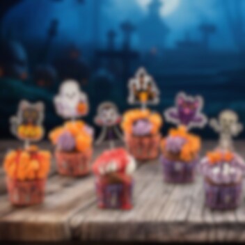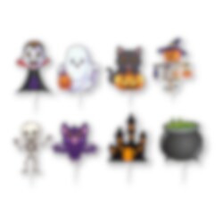 Dekorer dine bagværk til Halloween med disse farverige caketoppers. Pakken indeholder 16 motiver med spøgelse, græskar, flagermus, heks og meget mere. Nemme at sætte i cupcakes, muffins og kager for en festlig og legende stemning.