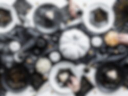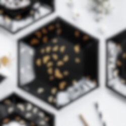 Disse sorte paptallerkener er sekskantede og dekoreret med skinnende guldflagermus, som giver et luksuriøst og festligt udtryk. En perfekt detalje til halloweenbordet.