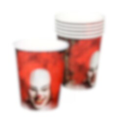 6 papkrus med et rustikt motiv af en klovn foran en blodig baggrund. Krusene er cirka 9 cm høje og rummer cirka 250 ml.