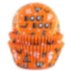 50 stk. muffinforme i orange farve med et fint motiv og med teksten "Boo! Boo!" I bunden. God at have, når man skal bage seje muffins til Halloweenfesten. Cirka 5 cm store.
