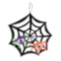 Sort edderkoppespind med et motiv af to farverige edderkopper, som er en fantastisk dekoration til Halloween. Edderkoppespindet er lavet af filtstof og er 33,5 cm i diameter.