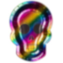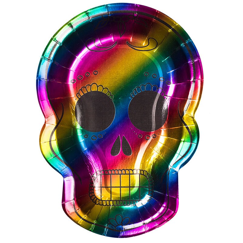 8 seje tallerkener formet som kranier i skinnende farver. Tallerkenerne er lavet af karton og måler 23 x 16 cm.