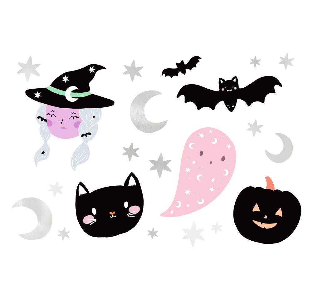 20 stilfulde tatoveringer med forskellige seje Halloween-motiver som hekse, flagermus, spøgelse, græskar og en sød lille kat. Instruktioner om, hvordan du bruger dem, findes på bagsiden af pakken.