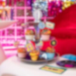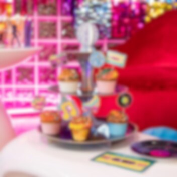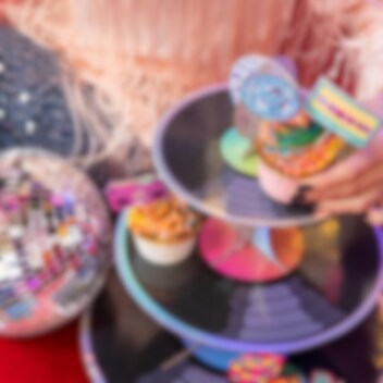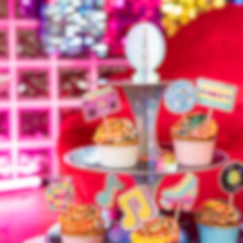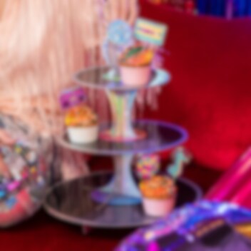 Giv festen et glitrende touch med denne spektakulære muffinsstander i diskotema. Med tre etager og en skinnende diskokugle på toppen bliver den et perfekt midtpunkt på dessertbordet. Standeren er 39 cm høj og 34 cm bred, designet til at fremhæve dine muffins og bagværk på en festlig måde. Et must for alle, der elsker disco og fødselsdage med stil.