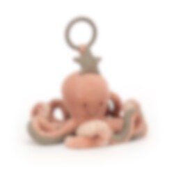 Et sjovt aktivitetslegetøj i form af en lyserød blæksprutte med otte arme. De forskellige dele af blæksprutten har raslende, raslende eller bippende lyde og strukturer at udforske, en bidering til de trængende og mange snurrende arme at lege med og altid et glad smil at byde på. Hænges med en ring i vognen eller hvor du nu ønsker det. Lavet i polyester og håndvasket evt.