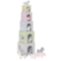 Stableklodser i dejlige farver med tilhørende bondegårdsdyr fra Jabadabado. Klodserne og dyrene er lavet af hård pap, og hver klods har sit eget motiv og et tal mellem 1-5. En sjov dåbsgave, som ikke kun er sjov at lege med, men som også hjælper barnet til at lære at tælle. Den største terning har tallet 5 og er 12 cm stor.