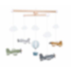 Træ uro fra Jabadabado, med farverige fly og en luftsballon, der alle hænger på snore. En dejlig dåbsgave, som forældre kan hænge over krybben eller puslebordet, så den stimulerer babyens sanser og bevægelser i løbet af de første måneder. Uroen er 36 x 36 x 36 cm stor.