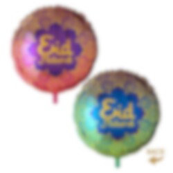 Skab en festlig stemning med denne elegante Eid Mubarak-folieballon! Med sit smukke mønster i guld og forskellige farver på for- og bagsiden bliver den en perfekt dekoration til din Eid-fest.