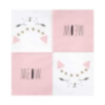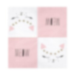 20 stk. hvide servietter med motiv af en kat med lyserøde ører på den ene side og teksten "Meow" på den anden. Dæk op med disse, når det er tid til kattefest. Servietterne er 3-lags og er ca. 33 x 33 cm store, når de er udfoldet.