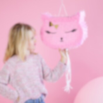 Pinata som forestiller en lyserød kat. Fyld pinataen med slik og legetøj, og lad derefter børnene trække i snorerne for at se, hvem der tømmer indholdet. Et sjovt produkt at afslutte festen med. Pinataen er ca. 35 x 27 x 9 cm og sælges tom.