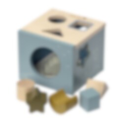 Æsken indeholder 6 træklodser i forskellige former og farver. Æsken måler 13,5 x 13,5 x 11,5 cm.