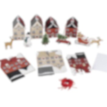 Fantastisk gør-det-selv-adventskalender med æsker, der bliver til en hyggelig julelandsby, fyld dem med lækkerier eller legetøj, som de små kan åbne hver dag. Kalenderen er sjov og nem at samle. Hver pakke indeholder: 24 stk. papkasser formet som små huse, 12 stk. 3D figurer i pap, 1 stk. ark med nummererede klistermærker og 24 stk. klip stykker af rødt garn for at binde kasserne sammen. Produktet og emballagen er genanvendelige og FSC-certificerede.