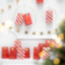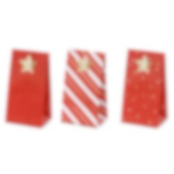Super fin adventskalender med røde papirsposer og tilhørende guldklistermærker formet som stjerner med tallene 1 til 24.