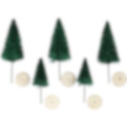 5 stk. grønne juletræer i to forskellige højder lavet af tætte nylonstrenge på snoet ståltråd. Fastgør træerne til de tilhørende små træfødder, og placer dem for eksempel i et lille julelandskab eller uden for din nissedør. Træerne er ca. 40 + 60 mm høje.