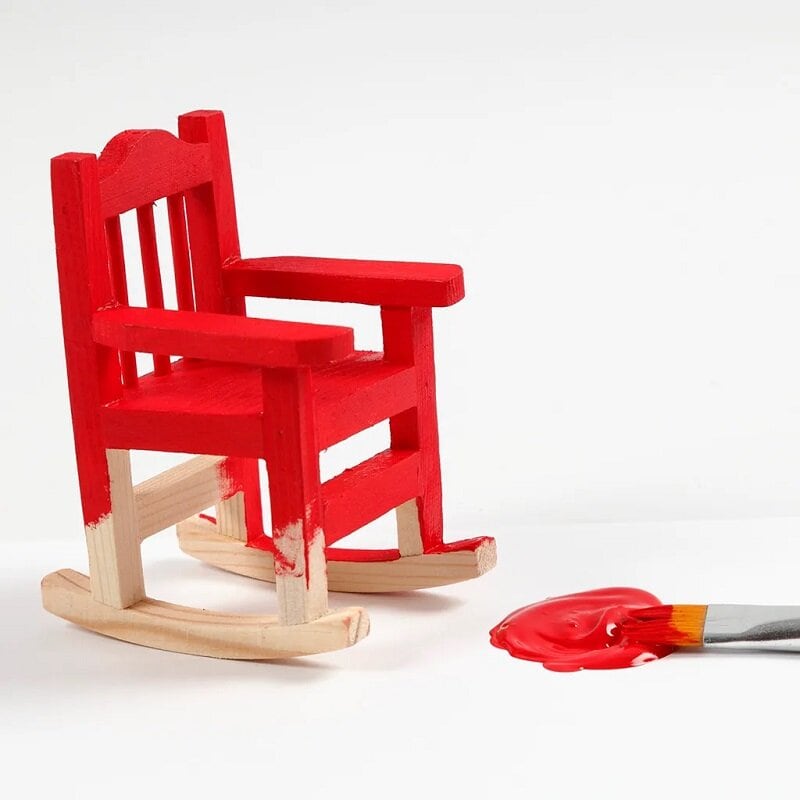 Lille gyngestol i lyst træ med en størrelse på 9 x 7 x 5 cm.