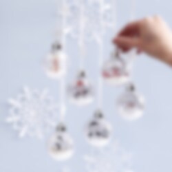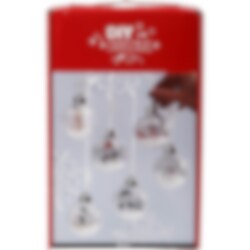 DIY - Craft kit, der bliver til 6 stk. unikke julekugler, når de er færdige. Mal papindlæggene, og fix resten af ​​indholdet. Læg det derefter ind i kuglerne for at få søde og personlige dekorationer til at hænge på juletræet. Pakken indeholder 6 stk. todelte kugler i akryl, 20g kunstig sne, 6 stk. colortime dobbelttusch, 1 hvid glitterlim, pailletter og 3m hvidt satinbånd samt instruktioner.