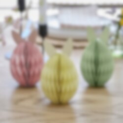 Dekorer dit bord med disse søde påskeharer i pastelfarver. Disse honeycomb-dekorationer er den perfekte måde at tilføje et touch af påske til enhver borddækning. Du kan også bruge den medfølgende tråd, hvis du vil hænge dem op.