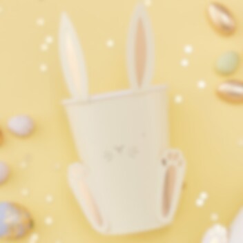 8 stk. pastelfarvede papkrus med motiv af kaninansigter og med 3D ører og fødder med detaljer i guldfolie. Krusene er 9 cm høje og rummer 270 ml.